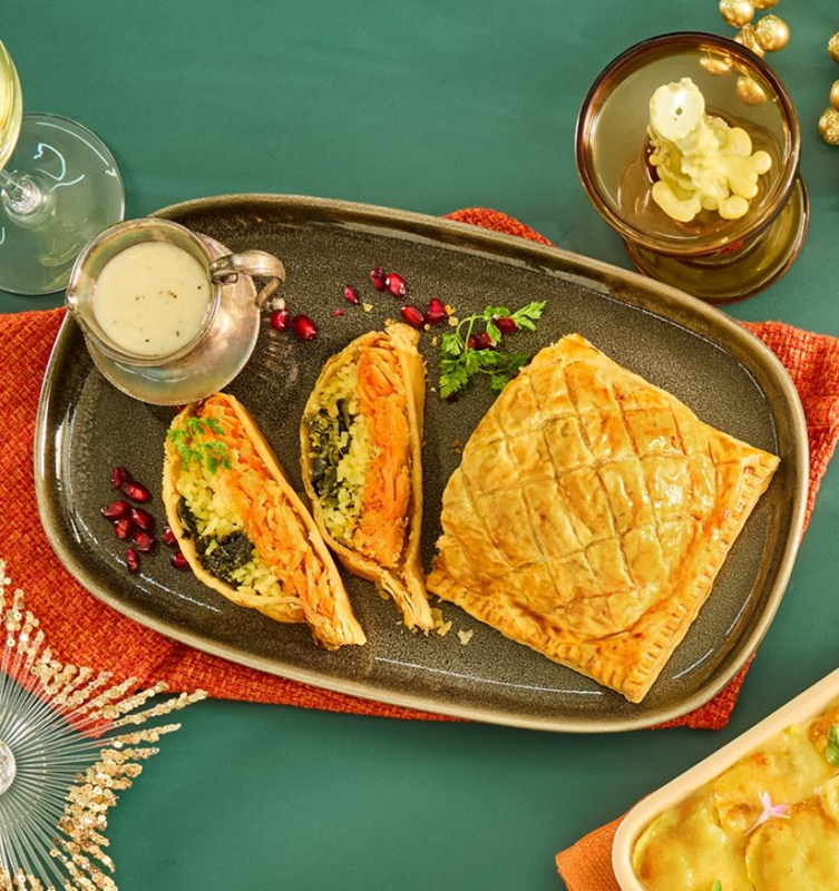 A luxurious, all-in-one pastry masterpiece – layers of flaky puff pastry enveloping succulent salmon, herbed rice, mushrooms, and eggs, offering a rich, elegant dining experience in every bite.